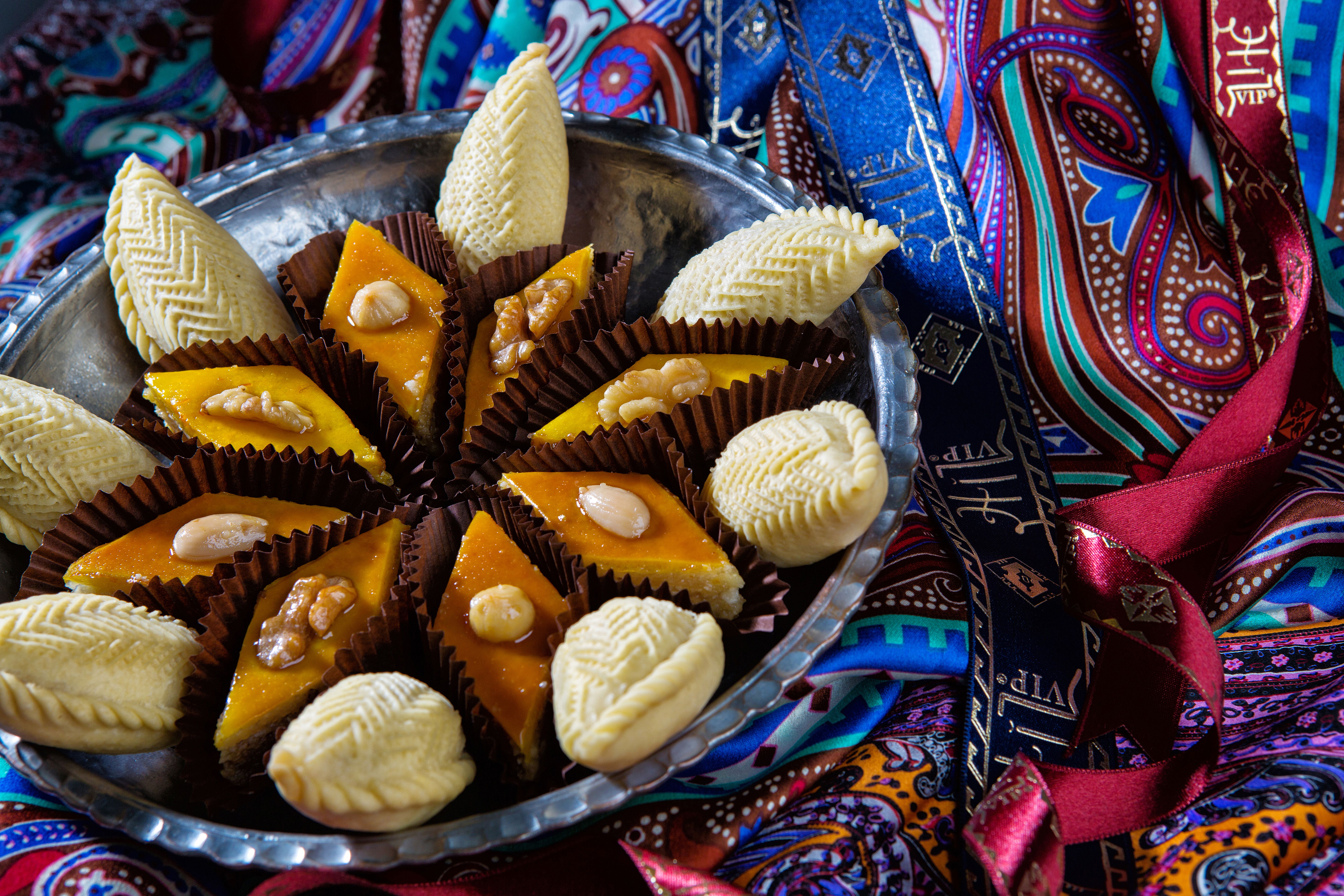 מדובר בשולחן מעוצב שעליו מוצגים מגשי מתוקים, עוגיות ומאכלים מסורתיים.